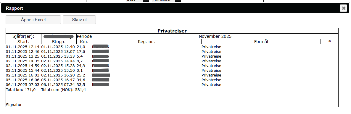 Når rapporten åpnes i Excel vises også en oppsummering av antall dager og kilometer privatreiser per sjåfør hittil i år.