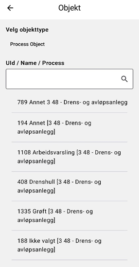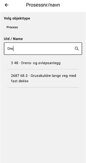 I listen kan det scrolles eller bruke søkefeltet og trykk på ønsket prosess