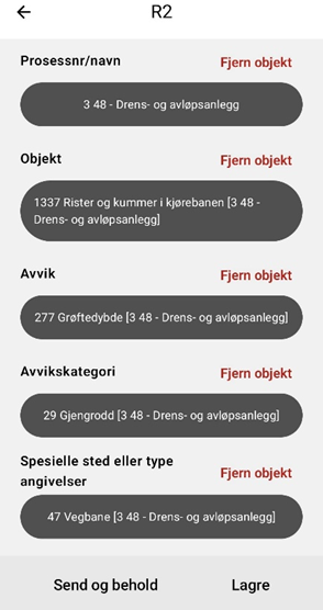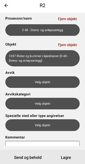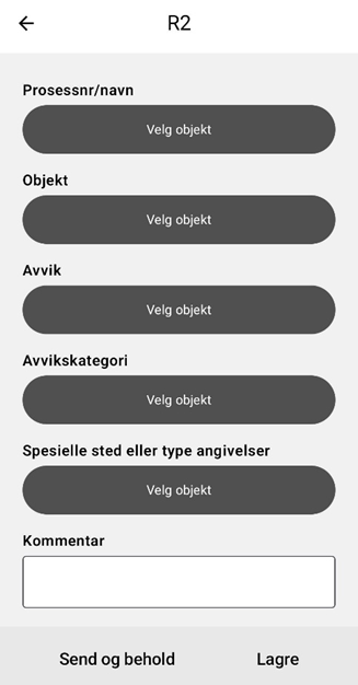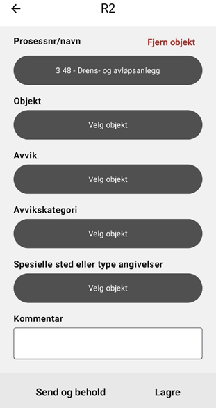 I R2 ligger det databaser som gjør at det skal være lettere å fylle ut feltene. Det vil si at de valgene en har på objekt henger sammen med hvilke prosessnummer man har valgt over. De avvikene man har tilgang på avhenger av hvilket objekt man har valgt osv. Derfor må skjemaet fylles ut ovenfra og nedover.